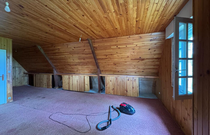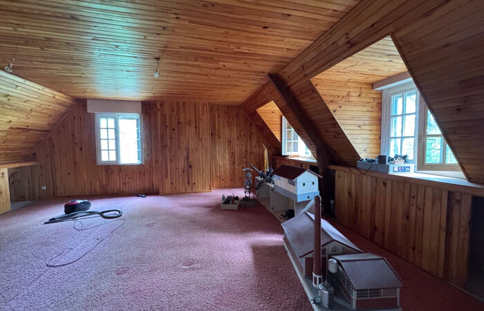 À l'étage, vous trouverez deux chambres, une salle de bain, un WC indépendant, ainsi qu'une vaste pièce de 31 m2 actuellement utilisée comme grenier. Cet espace offre un beau potentiel d'aménagement soit pour créer une chambre supplémentaire ou un espace de loisirs selon vos besoins.
